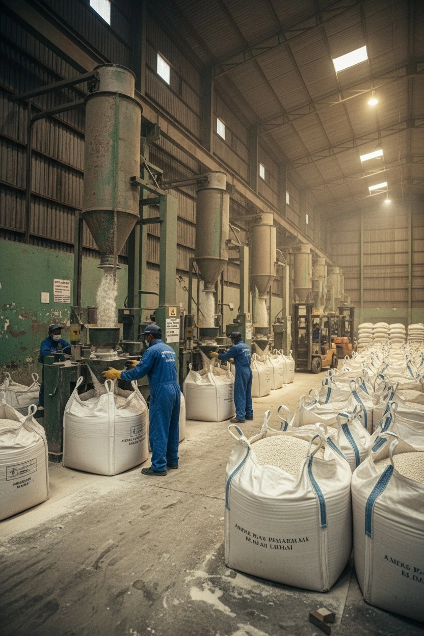 Karung jumbo untuk penyimpanan hasil daur ulang seperti resin dan plastik pellet, tersedia untuk kebutuhan industri.